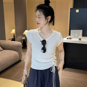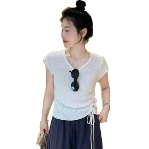 小柄なフライングスリーブアイスシルクニット半袖Tシャツレディース夏巾着ウエスト不規則ショートスリムフィットトップ