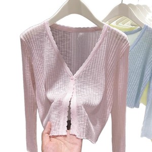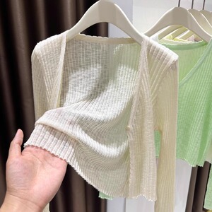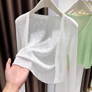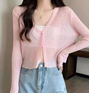 女性用の青い薄いニットアイスシルクカーディガン、夏のサスペンダースカート、空調シャツ、日焼け止めショールトップ、女性用ブラウス