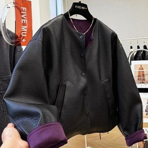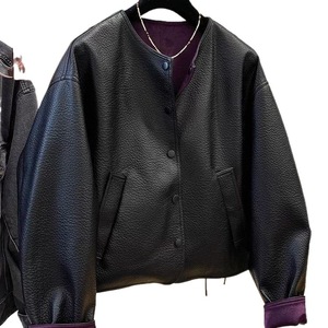 高級感、見栄えの良い、シックなラウンドネックショートレザージャケット、女性用春秋レトロ無地デザインジャケット