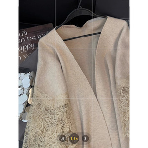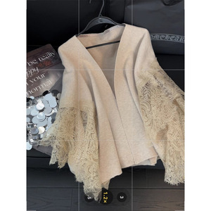 女性用レーススプライシングニットショールのリアルショット、フレンチスタイル、レディスタイル、2025秋スタイルのマントセータージャケット