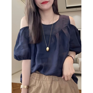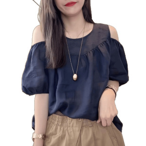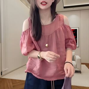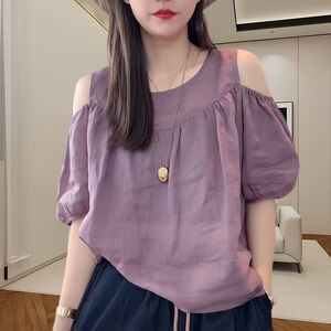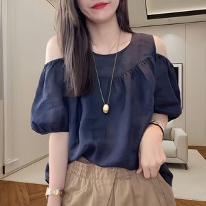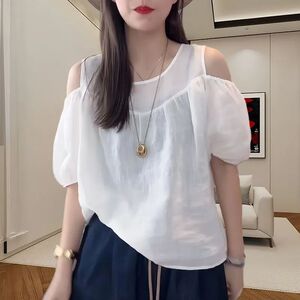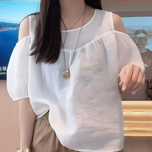 女性用のスタイリッシュなシャツ、新しい夏の韓国スタイルのラウンドネックオフショルダーデザインの半袖シャツ、スリムで年齢を減らすファッショナブルなシャツ