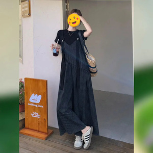 一枚/2025夏には、太ったmmの小さなデザイン感のあるストライプのバックパンツのワイドパンツの純色の半袖上着を着る