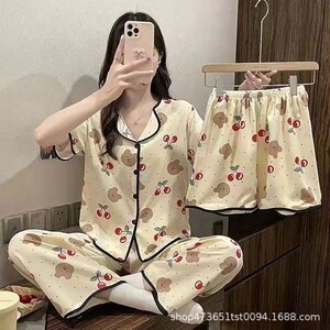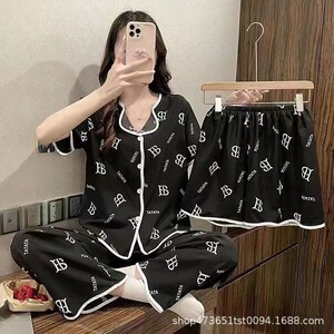 新しいレジャーウェアパジャマ女性用半袖3点セットカジュアルシンプルゆったりホームウェアセットins風