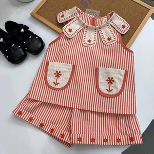 女の子の新しい夏のベストスーツ女の赤ちゃんストライプ花びら襟ノースリーブベビードールシャツ純綿ショーツツーピーストレンディセット