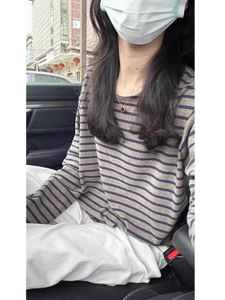 日本のレトロな文学的なスタイルのグレーストライプラウンドネック長袖Tシャツ女性用、ゆったりとした年齢を軽減するインナーレイヤリングシャツ、秋のトレンド