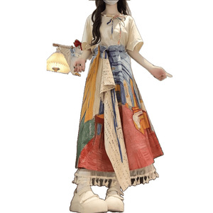 ゴッホの油絵風の不規則なスカートの夏の新しいスタイルのアーティスティックなトップスのセットを着用する女子学生向け
