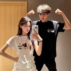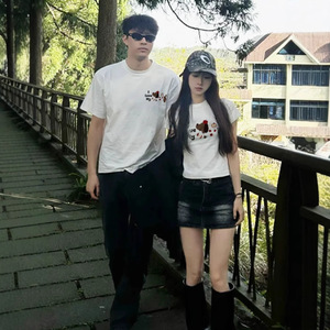夏の純綿半袖Tシャツカップル着用レイジースタイルルーズニッチデザインメンズとレディーストップス学生トレンディなブランドクラスの制服