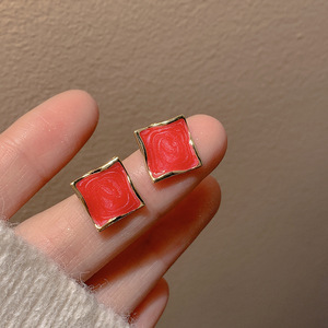 红色方形耳钉-