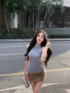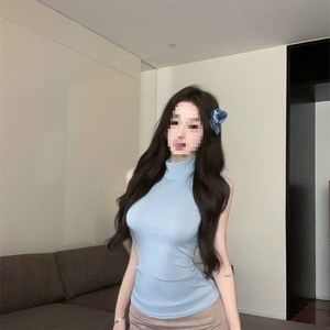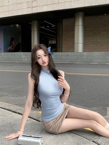 ブルーハーフタートルネックノースリーブベストトップ Tシャツレディース夏スリムウエストファッションハーフスカート 2 点セット