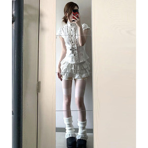 スイートスタイルスリムスタンドカラーシャツ半袖ニッチトップ夏新作ローウエストケーキスカートミニスカート2点セット