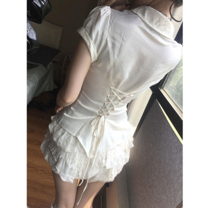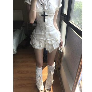 サテンレースステッチドールカラースリム半袖シャツトップレースサテンパフショートローウエストフラワーパンツ