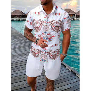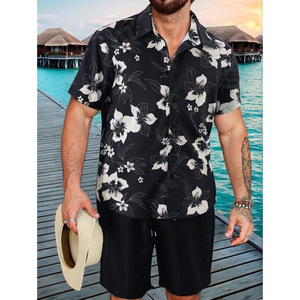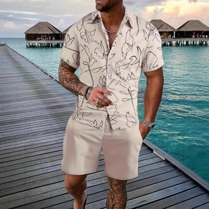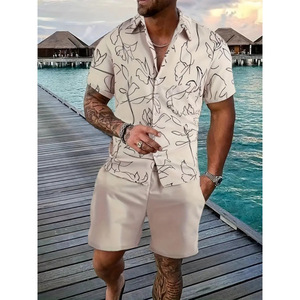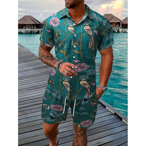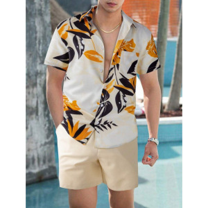跨境欧美风亚马逊跨境百搭植物图案3D印花短袖村衫短裤套装