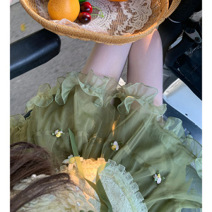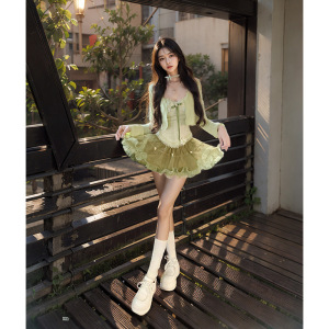 【森の秘密】プリンセスチキンのピュアラブスタイルフレンチトップス+ふわふわウエスト痩身ショートスカートカーディガンセット