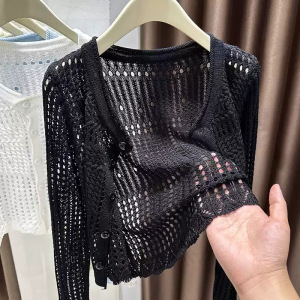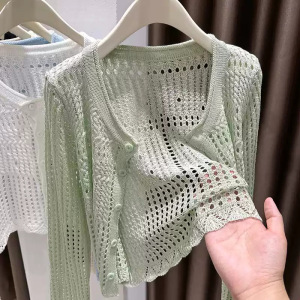 女性用日焼け止めカーディガン、薄い中空ニットショートブラウス、小さなショール、サマーサスペンダースカートジャケット