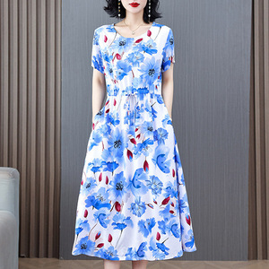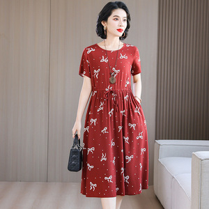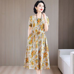 2025新款气质棉绸连衣裙女夏季时尚收腰显瘦中长款人造棉印花裙子