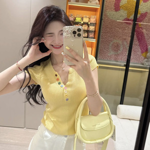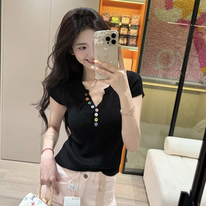 カラフルなボタン V ネックセーター半袖レディース Tシャツ 2025 夏の新スリムショートセータートップ