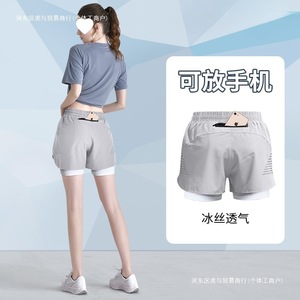 ランニング用女性用スポーツショーツ、携帯電話を収納可能、露出防止裏地、速乾性スポーツフィットネス高校入試ヨガ3点パンツ