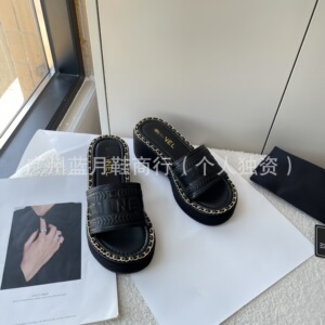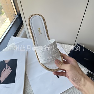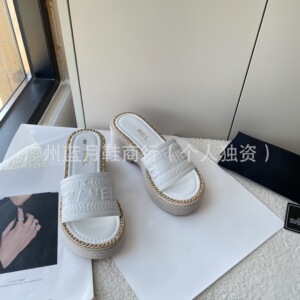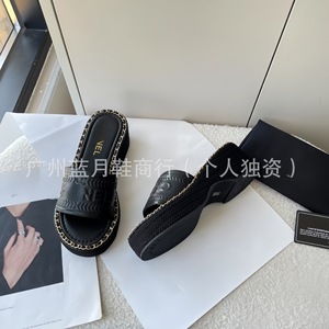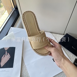 2025 新しいスタイルのニットわら厚底ウェッジヒールレディースアウターウェア高さ増加チェーンビーチスリッパ女性の夏