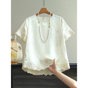 新中国式の国風は酢酸の半袖の上着の女性の2025夏の新型のファッションの百合の気質の丸首のtシャツをまねます。