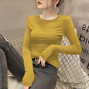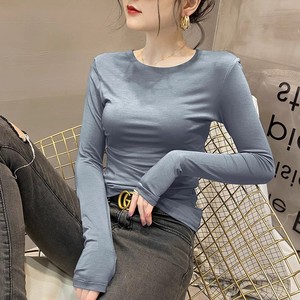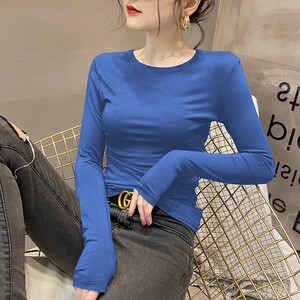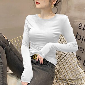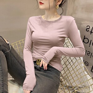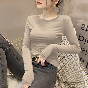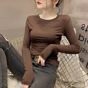 女性のための小さなラウンドネックボトリングシャツ 2025 新作春秋冬長袖 Tシャツスリムフィット西洋スタイルコーヒー色のインナートップ