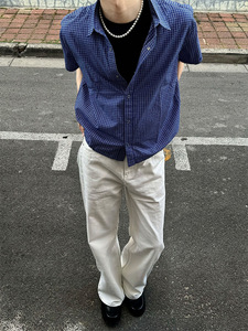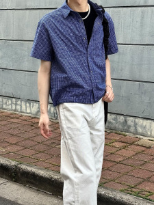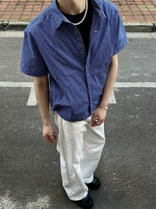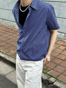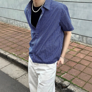 ロイヤルブルーの格子縞半袖シャツ男性の夏の高級感のある縄張りの格子シャツの古いお金風半袖コート