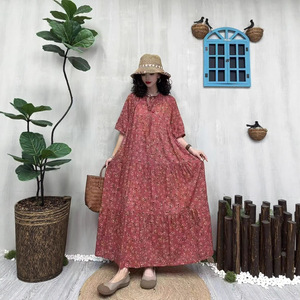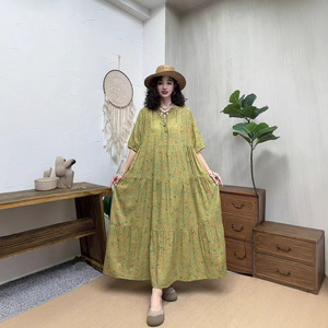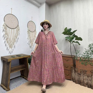 2025 シンプルでファッショナブルなボヘミアンロングスカート夏の新しいプラスサイズ半袖ラウンドネックプリントドレス