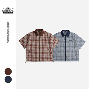 BUILTTOLAST デザイン ジッパー プライヤ レトロ チェック柄 ワークシャツ メンズ 半袖 トップ ジャケット CD01