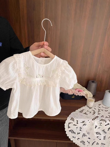 女性の赤ちゃんの薄いタイプの通気性のある肌の綿の半袖のシャツの上着の女性の赤ちゃんの夏の女の子のレースの刺繍の子供のシャツ