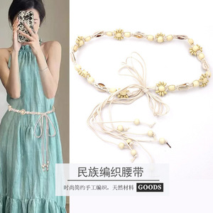 ボヘミアンスタイルベルト、ココナッツシェルと木製ビーズの手織り、ナチュラルなリゾートスタイルワックスコード、女性用エスニックスタイルベルト、ウエストロープ