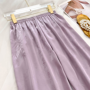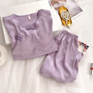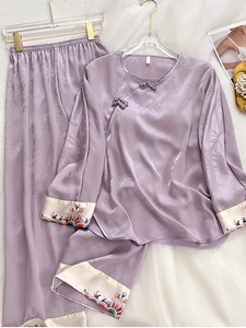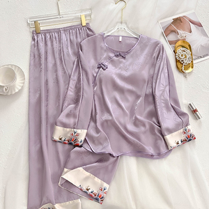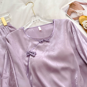 新しい中国風の女性用シルクパジャマ、春と秋の長袖マルベリーシルクホーム服セット、胸パッド付きパープル