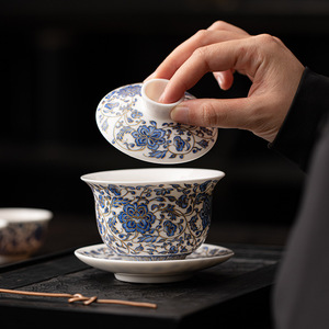 高級羊脂翡翠ティーセット、シングル青と白のホバー回転カバーボウル、セラミック非火傷性三才茶ボウル、蓋付き