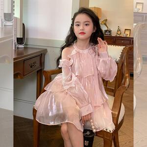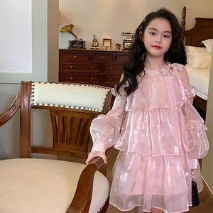 2025 女の子服ピンクオーガンザプリンセスドレス子供ベビーホルターネックドレスオフショルダードレス
