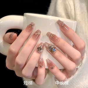 純粋に手作りされたウェアラブルネイル、シャンパンカラー、ミディアムレングスマニキュアパッチ、氷のように透明なキャットアイ、絶妙な輝くダイヤモンドのフェイクネイルパッチ、美白