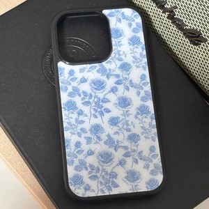 Apple 16/iphone13P/12/11/X 光沢のある表面に適した青い花柄の黒いエッジパッチ携帯電話ケース