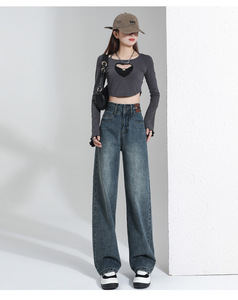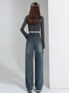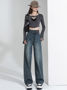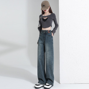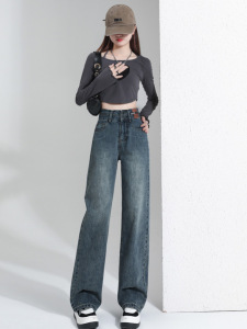 复古直筒牛仔裤女新款百搭高腰显瘦学院风小个子垂感阔腿拖地裤
