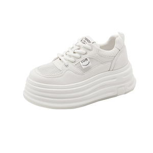2025新型の厚い底の本革の白い靴の女性のネットの表の靴の運動靴の女性の韓国版の中で高くなるレジャーの板の靴