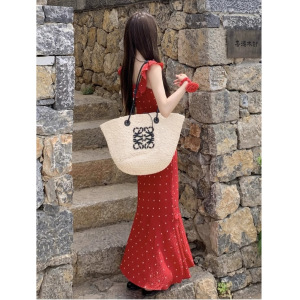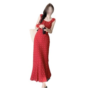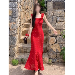 赤い水玉模様の小さなフライングスリーブサスペンダードレス女性の夏の腕をカバーするドーパミン海辺の休暇フィッシュテールビーチロングドレス