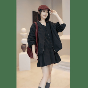 设计感穿搭一整套2025春季新款复古气质圆领拉链短外套吊带裙女装