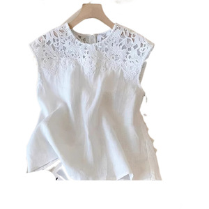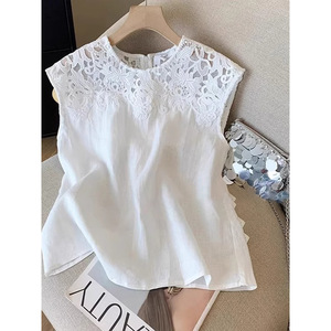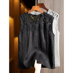 フレンチレトロリネンベスト Tシャツ女性のための 2025 夏ルーズヘビー刺繍中空レースコットンとリネンノースリーブトップ