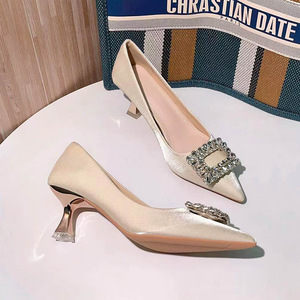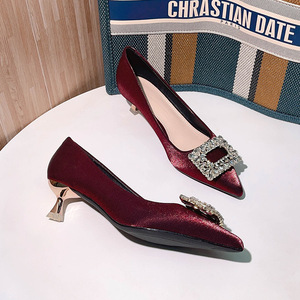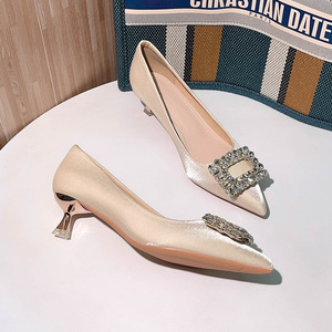 法式尖头水钻细跟伴娘高跟鞋女2025新款杏色浅口单鞋女3矮低跟