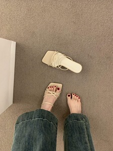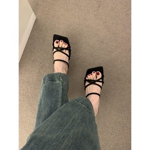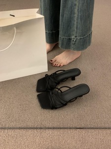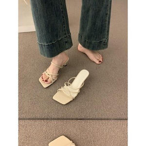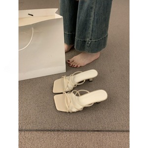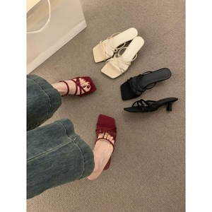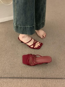フランスのハイエンドのオープントゥスクエアトゥレッドキトゥンヒールスリッパ、女性用夏アウター2025新しいスタイルの美しいサンダル