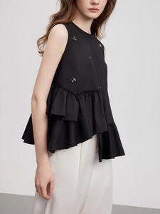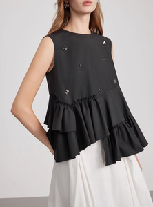 ELLE モダンビーズフリルノースリーブシャツ女性のための 2025 夏の新しい不規則なデザインファッショナブルなシャツ