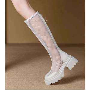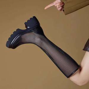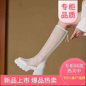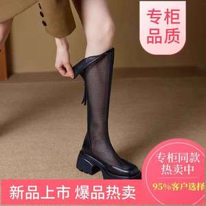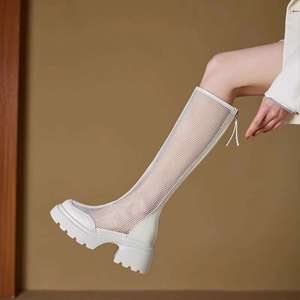 夏のブーツの女性2025年の新型の黒い網の薄い金の厚い底の太さと透かし彫りのブーツは高くなって爆発します。