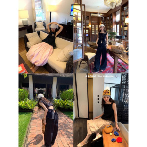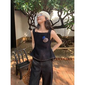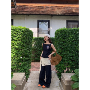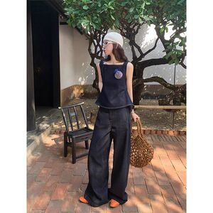アメリカンレトロなバック中空ストラップデザインベストトップ女性の夏のルーズストレートデニムワイドレッグパンツスーツ