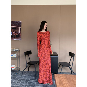 春夏の新作シフォンプリントスタイルホリデー長袖ドレスレディース春夏スリム気質ロングドレス