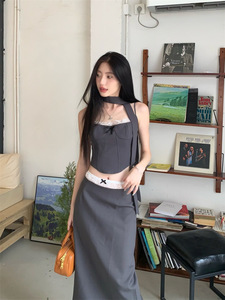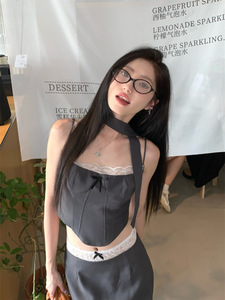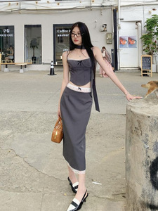 2025夏の純粋な欲望のスーツの灰色のレースの縁のサスペンダーのベストの女性の夏の高い腰はやせている半身のスカートの2つのセットを現します。