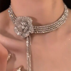 2025 新フラッシュダイヤモンドタッセルフレンチフラワーフルダイヤモンドチョーカー女性の花嫁のウェディングドレスアクセサリー立体鎖骨チェーントレンディ
