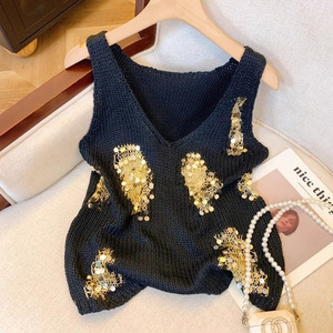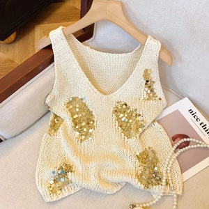 フランスのヘビーデューティスパンコールVネックニットベストレディース夏アウターノースリーブベストブラウスレイジーハイエンドトップ