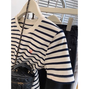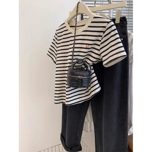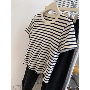 ストライプ半袖 Tシャツ女性の夏ルーズ 2025 新しいトップドーパミン着用気質イントレンドドロップシッピング