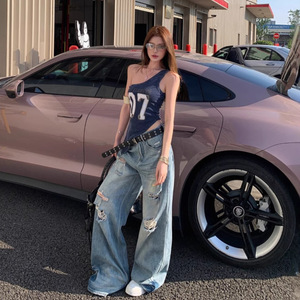 リアルショット!アメリカンレトロホットガールオフショルダーベストトップ女性用ハイストリートリップドジーンズルーズワイドレッグフロアレングスパンツ